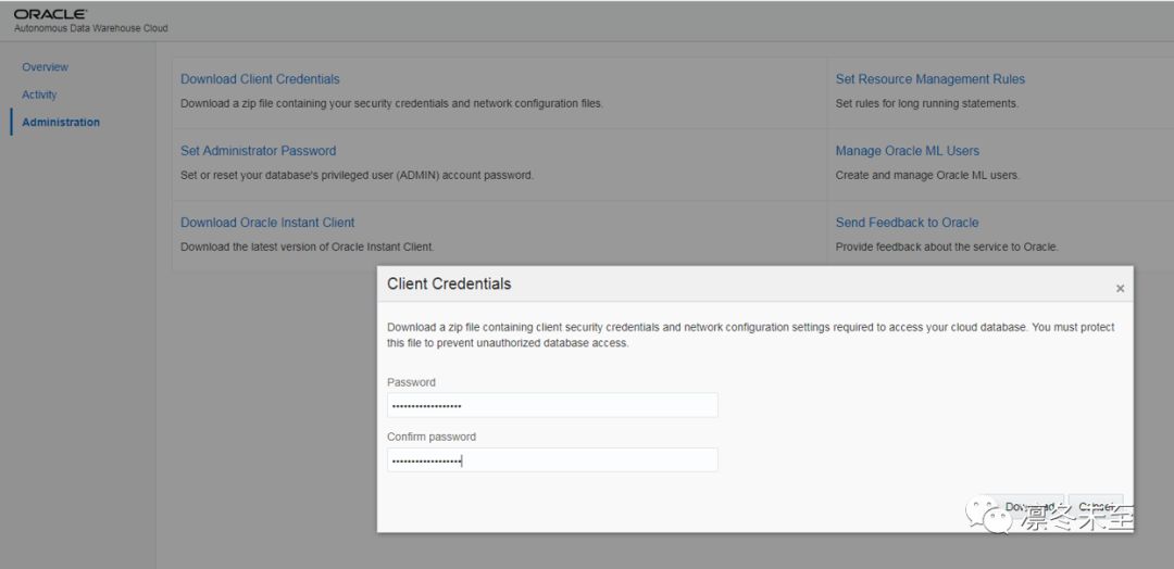 进入ADW/ATP的实例界面,点击“ServiceConsole”界面进入ATP数据库的控制台,在“Adminitration”中点击“Download Client Credentials”,下载客户端信任文件。