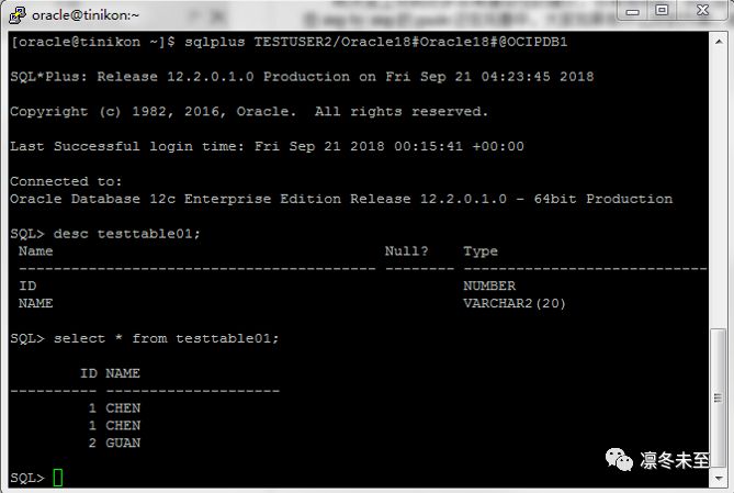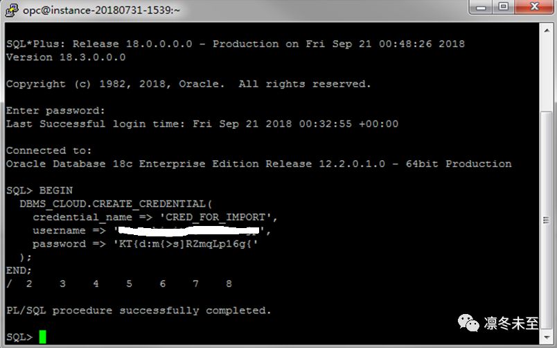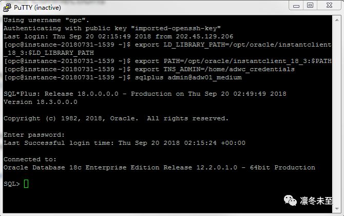 然后使用sqlplus连接到ADW/ATP实例,admin为用户名,adw01_medium为tnsnames.ora文件中该实例的一个服务名。密码在之后输入,该密码为你创建ADW/ATP时设置的密码。