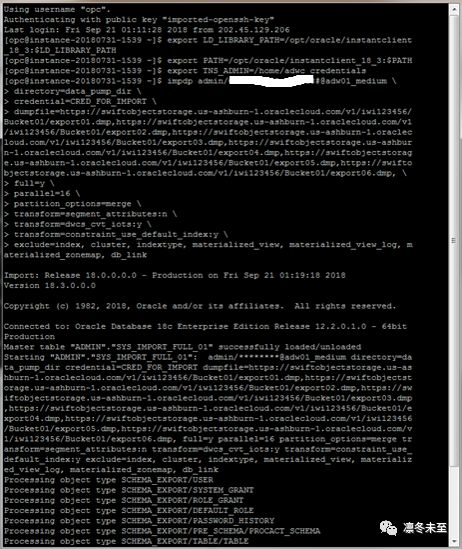 上一篇文章中我们介绍了通过DBMS_CLOUD包将OCI Object Storage上的文本文件导入到ATP中的实现方法。但在实际应用中,比如将本地数据库迁移到ADW/ATP时,可能需要将原数据库的dmp文件import到ADW/ATP中,这是DBMS_CLOUD包所不能处理的,那么就要用到impdp命令来进行数据的导入到ADW/ATP中。但是我们也知道,ADW/ATP中我们并不能直接访问数据库所在的服务器,所以我们需要一台可以运行import命令的机器来执行这个操作。