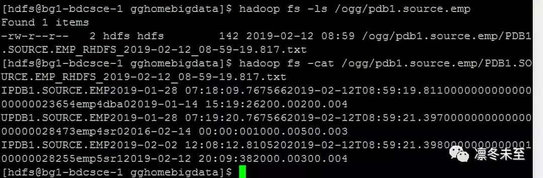 我们看到所有GoldenGate队列中存储的数据都被加载到了Hadoop平台的HDFS中。我们为了演示使用的默认的数据输出格式,在正式环境中客户可以根据需要对输出内容进行定制以满足不同类型的需要。