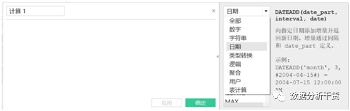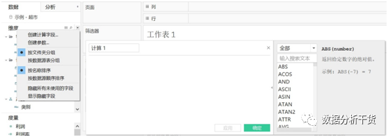(一)Tableau的函数从哪看得到创建字段——弹出的计算字段设置框中选择向右的箭头,就可看到,然后,在“全部”的下面输入搜索文本,即可找到各种函数的含义及用法,如下图所示