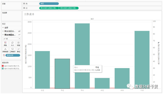 将“地区出现的次数(重复计数)”和“地区出现的次数(不重复计数)”依次拖拽至行,将“地区“拖拽至列,选择“地区出现的次数(不重复计数)”的下三角中的“双轴“,并将该字段的坐标轴的刻度改为”0-100“之间,将该字段的左侧”标记“下的”条形图“改为”线“