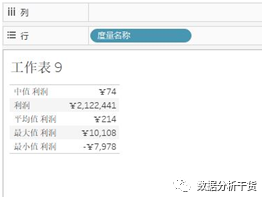 第一步:双击行,在行里输入“sum([利润])”,按回车,同理双击行,计算利润的平均值avg([利润])、中位数median([利润])、最大值max([利润])和最小值min([利润])