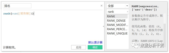 当然,也可以将排序设置为由低到高,即排名为1的表示销售额最小,从该函数的语法中可以见,使用“asc”即可,因为”asc”表示升序,排名越大销售额越高