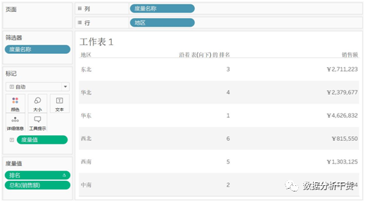 于是,排序结果如下(由低到高,最低的销售额排名为1,排名值越大表明销售额越高):