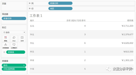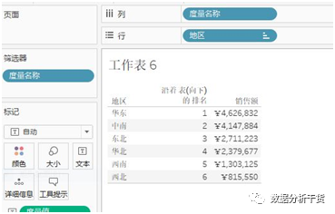 把“销售额”拖拽至文本,再把“排名”也拖拽至文本,