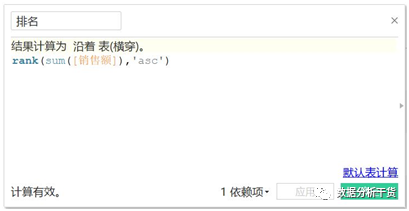 操作:从创建字段的rank函数查询可知,rank是为分区中的当前行返回标准竞争排名,它适用于函数的聚合,比如rank(avg[LapTime])