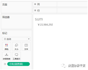 只要把一个度量字段,比如“销售额”拖拽到文本,就可以得到sum。见下图