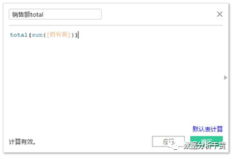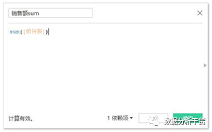 或者我们创建新字段“销售额sum”,创建如下图,也可以得到sum值