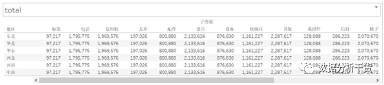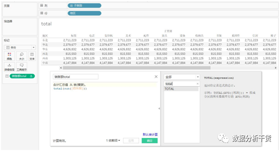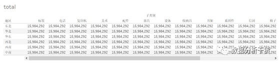 建立各地区、各子类别的销售额表格后发现,total所计算的是所选定的区域(比如本例中选的是横穿,也就是所选区域为行)的合计,因此会发现同一个地区内,所有子类别的销售额都是相同的,是各地区汇总的结果