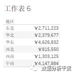 第四步:去掉“类别“,将”地区“拖拽至行,于是得到下表
