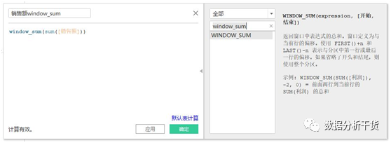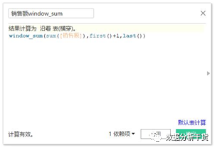 于是得到销售额window_sum的字段,在创建过程中该函数,可见该函数返回的是窗口表达式总和,如果省略了开头和结尾,就是使用了整个分区。