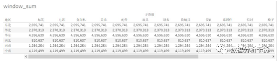 可以看到计算结果虽然也是沿行汇总,但数值变小,比如东北地区的汇总值2695741,比行合计2711223少了15482,由前可知,15482正是第1项“标签”的销售额,由此知,window_sum对分区的合计是可以指定起止点的,要比total更为灵活