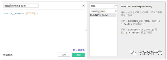 Sum:计算合计,会根据对比维度来进行相应的调整,比如计算了销售额sum,若比较地区,得到的结果就是某地区销售额合计,和其他地区销售额合计的对比Running_sum:计算的是某个指定区域内第一行到当前行的逐渐累加