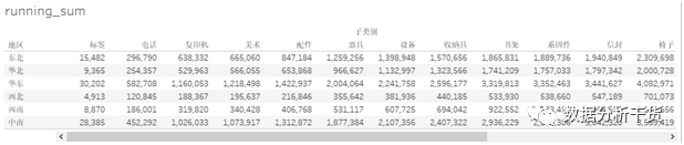 以东北地区为例,两者在第一项“标签”上的销售额是相同的,都是15482,但“电话”的实际销售额为281308,而running_sum计算的结果却是296790,两者差刚好是15482,“标签”的销售额,由此可知running_sum是在指定的区域内逐渐实现累加的,比如第二项“电话”的running_sum就是标签和电话的销售额的累计,第三项”复印机”的running_sum则是“标签“、