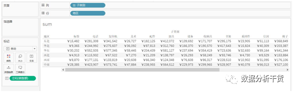 将“子类别”和“地区”分别拖拽至“列”和“行”,然后将销售额拖拽至“文本”,销售额下三角处选择表(横穿),于是得到如下结果: