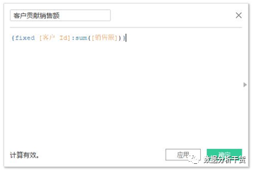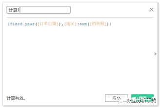例如,想求分年份、分地区、分产品的销售额合计,就可以写成:{Fixed [year],[area],[products]:sum[sales]}再比如,想求分年份、分地区的销售额合计,就可以写成:{Fixed [year],[area]:sum[sales]}再比如,想求分年份的销售额合计,就可以写成{Fixed [year]:sum[sales]}而如果不指定维度,就只想求全局的销售额合计,就可以写成{Fixed:sum[sales]}:可简写为{sum[sales]}