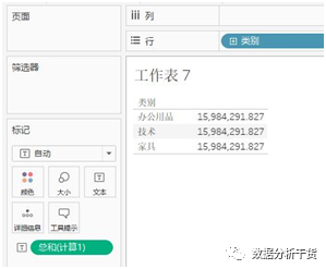 对一组数据进行聚合运算。Tableau自带聚合功能,比如将类别和销售额拖拽至行和列,则自动计算各类别的销售额合计