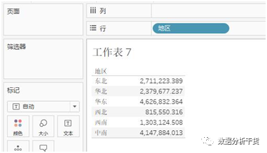 例如,现在求销售额的合计,即你把销售额sum拖拽至文本,得到所有产品的销售额合计为15984292 。这个数值把不同时间、不同子类别、不同地区的销售额都汇聚到了一个数值点上,所以它的聚合度很高。但相应的,由于这个数值只有一个数值点,反映的信息太少了,不能反映细节,因此颗粒度很小。但是如果现在统计的是分地区的销售额,显然聚合度降低了,因为没有各地区销售额合计的汇总程度高,但是它却能反映各地区销售额差异的细节,所以颗粒度升高了。