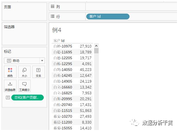 第二步:将“客户贡献销售额“拖拽至文本,将”客户ID“(若在维度中看不到,右键空白区域“显示“隐藏字段,然后点击”客户ID“后面的下三角,选择”取消隐藏“)拖拽至行,于是得到按客户ID统计的销售额。见下图
