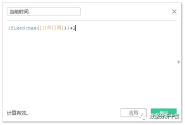 第一步:创建计算字段 #当前时间#={fixed:max([订单日期])}+1,+1是为了避免0值的出现