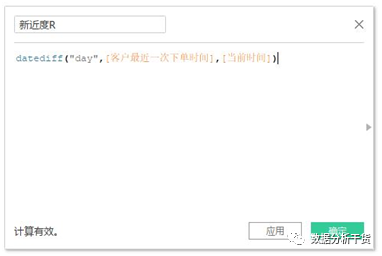 #新进度R#=DATEDIFF(“day”,#客户最近一次下单时间#, #当前时间#)
