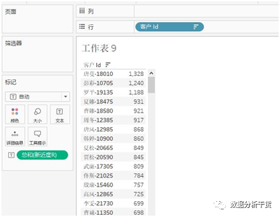 第四步:将“客户ID“拖拽至行,将”新近度“拖拽至文本,于是得到不同的客户最后一次购物时间距离当前时间的间隔,显然间隔越长,表明该客户越久没有光顾了,该客户就越有可能成为流失客户
