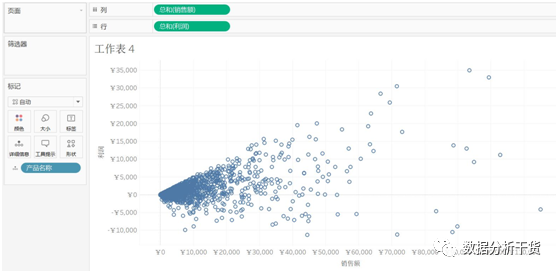 1、首先分别将“销售额“和”利润“拖拽到列和行,此时由于没有产品分类,所以只有总体表现的一个点,见下图。