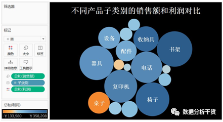 第二种:将“子类别”拖拽至“文本”,“销售额”拖拽至“大小”,利润拖拽至“颜色”,选择标记下