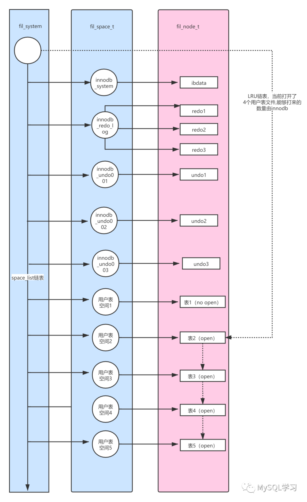 fil_space_t:为一个space结构代表一个表空间其中space_id包含在其中,下面是fil_node_t来表示各个物理文件,比如我们redo文件就包含多个,对于 innodb_file_per_table的表和undo文件来讲,每个fil_space_t都代表一个space,但是file_node_t自然就只有1个了。建立函数fil_space_create。当然这里的元素还很多,比如和hash结构相对应的元素,IO相关的元素等等。 fil_node_t:为一个具体文件的表示,其中name就是文件所在的位置,is_open则代表是否已经打开了(open),还包含一些和IO相关的属性,chain和LRU则分别代表自己在space和fil_system LRU链表中所在的位置。建立函数为fil_node_create。