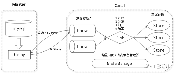 canal模拟mysql slave的交互协议,伪装自己为mysql slave,向mysql master发送dump协议。