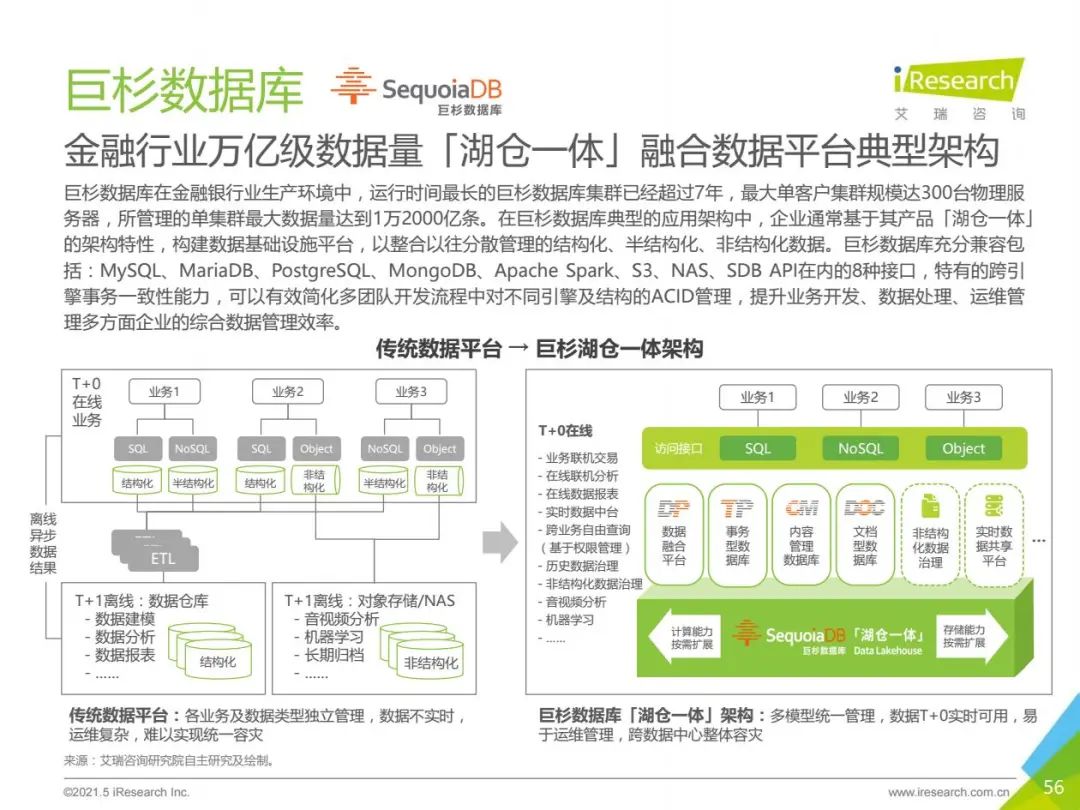 艾瑞咨询发布《2021年中国数据库行业研究报告》,可同时实现海量大数据联机交易和联机分析的「湖仓一体」创新架构成为数据库未来发展新趋势。