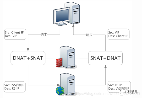 多目标的DNAT(iptables)转换;它通过修改请求报文的目标IP地址(同时可能会修改目标端口)挑选出某Real Server的RIP地址实现转发;在LVS负载均衡调度器上请求先发送给PREROUTING-->INPUT,然后经由监听在INPUT上的LVS程序强制将请求转发给 POSTROUTING