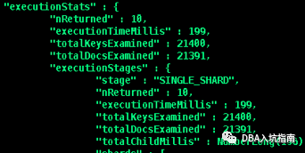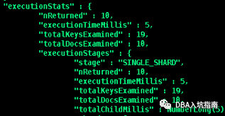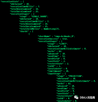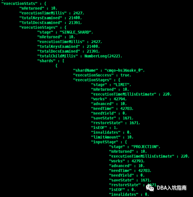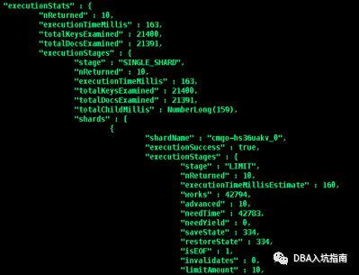 "executionTimeMillis" :查询计划选择和查询执行所需的总时间(以毫秒为单位)"totalKeysExamined" : 扫描的索引条目数"totalDocsExamined" : 扫描的文档数"works" : 查询执行阶段执行的“工作单元”的数量,查询执行阶段将其工作分为小单元,“工作单位”可能包括检查单个索引键,从集合中提取单个文档,将投影应用于单个文档或执行内部记账"advanced" : 返回的中间结果数量或者返回到父阶段的结果数"needTime" : 未将中间结果返回给其父级的工作循环数。例如,索引扫描阶段可以花费一个工作周期来寻找索引中的新位置而不是返回索引键; 这个工作周期将计入explain.executionStats.executionStages.needTime而不是explain.executionStats.executionStages.advanced"needYield" : 查询阶段暂停处理和让锁导致的存储层请求次数 (此锁机制可防止高优先级请求等待过长时间)"saveState" : 查询阶段暂停处理和保存它当前的执行状态次数,例如准备让出它持有的锁(yield)"restoreState" : 查询阶段恢复一个保存的执行状态次数,例如恢复之前让出的锁(yield),类似协程机制"isEOF" : 执行阶段是否已到达流的结尾,代表查询结束