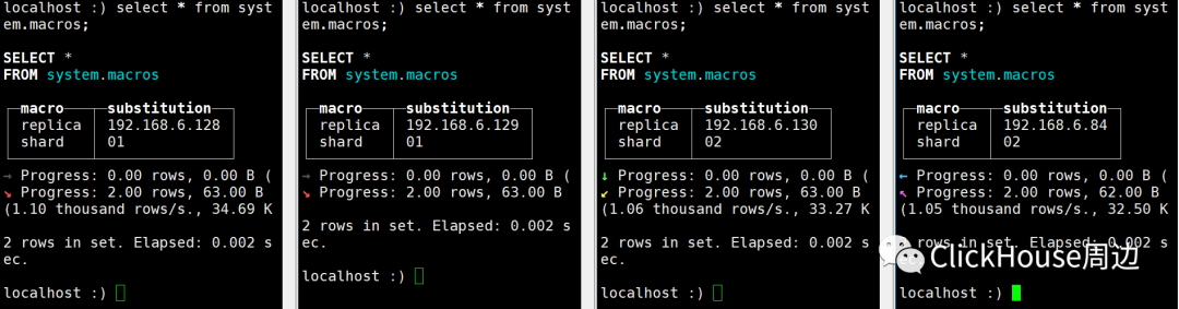 create table test_local ON CLUSTER my_cluster (ID Int8, Name String, BirthDate Date) \ENGINE = ReplicatedMergeTree('/clickhouse/tables/{shard}/test_local','{replica}') PARTITION BY toYYYYMMDD(BirthDate) ORDER BY (Name, BirthDate) SETTINGS index_granularity = 8192;ReplicatedMergeTree的定义方式 ENGINE =ReplicatedMergeTree('zk_path','replica_name')ClickHouse提供的配置模板