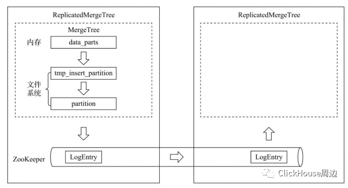 来自《ClickHouse原理解析与应用实践》一书 在MergeTree中,一个数据分区由开始创建到全部完成,会历经两类存储区域。 (1)内存:数据首先会被写入内存缓冲区。 (2)本地磁盘:数据接着会被写入tmp临时目录分区,待全部完成后再将临时目录重命名为正式分区,然后向/block节点写入该数据分区的block_id(用于去重)。ReplicatedMergeTree在上述基础之上增加了ZooKeeper的部分,它会进一步在ZooKeeper内创建一系列的监听节点,并以此实现多个实例之间的通信。