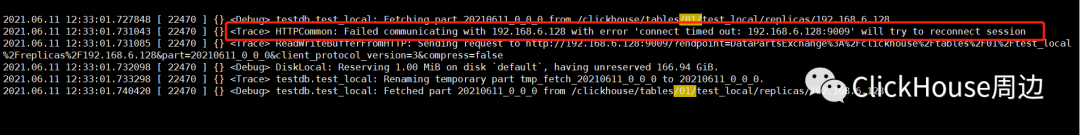 其中可以看到shard:/01/ 的192.168.6.129 选择拉取远端副本:192.168.6.128 的时候第一次下载请求失败。ClickHouse默认配置可以共请求5次。 shard:/02/ 192.168.6.84 选择拉取远端副本:192.168.6.130