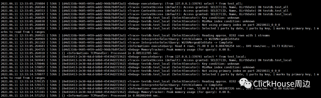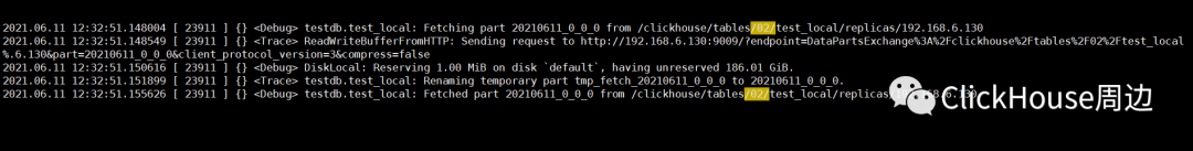 追踪日志信息可以看出,基于DataPartsExchange的响应后,先将数据写入了tmp_fetch_20210611_0_0_0,待全部数据接收完成之后,重命名该目录:Renaming temporary part tmp_fetch_20210611_0_0_0 to 20210611_0_0_0。 4.查询