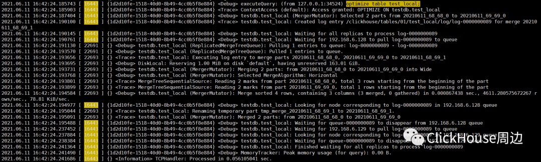 根据追踪的信息,操作类型为Merge合并,需要合并的分区目录是20210611_68_68_0 和 20210611_69_69_0。同时,主副本还锁住执行线程,对日志的接收情况进行监听: