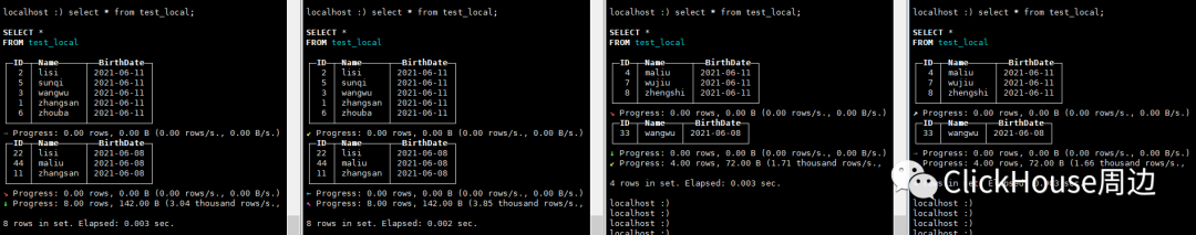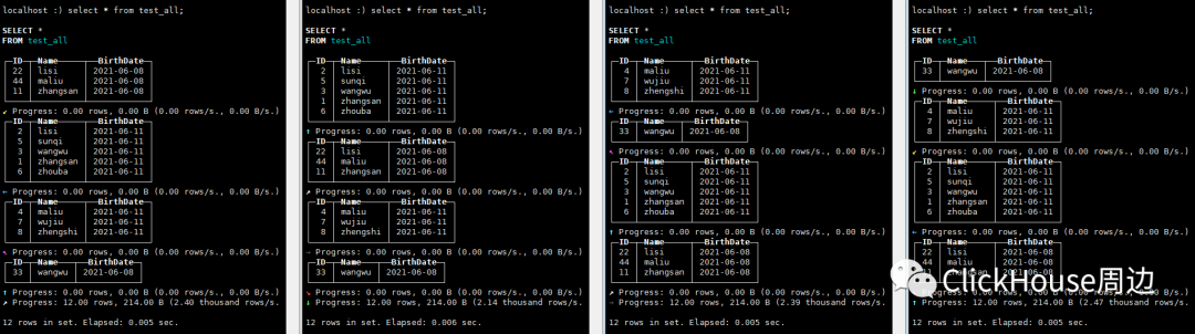 Selected 1 parts by date, 1 parts by key, 1 marks to read from 1 ranges5.合并 insert into test_all values(11,'zhangsan',now()-259200),(22,'lisi',now()-259200),(33,'wangwu',now()-259200),(44,'maliu',now()-259200);insert into test_all values(5,'sunqi',now()),(6,'zhouba',now()),(7,'wujiu',now()),(8,'zhengshi',now());