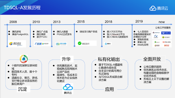 TDSQL-A是在腾讯业务发展过程中孵化出来的产品。最早的时候我们是用单机PG来做一些大数据平台小规模的数据分析以及结果缓存。但随着腾讯业务的扩张,我们发现单机的数据库已经无法支撑相关业务的数据量及请求量,就萌生了开发分布式数据库的想法。在2013年我们启动了第一个版本的开发。