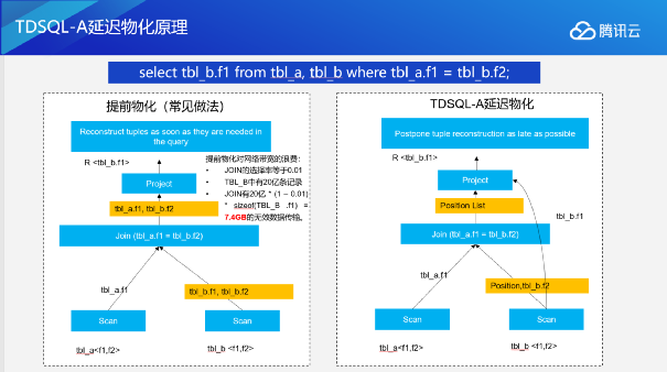 可以看到,在进行join时我们其实只关联了表b的f2这一列,但是投影时却投影了表b的f1这一列。这时对之前的数据库进行提前物化时,在传递数据给join时,我们就会把表b的f1和f2都吐出来。因为我们计算发现上层project需要f1这一列,但是join这里需要f2这一列,所以它就会把上层需要的所有列全部在这里算出来。但实际上如果在这个地方关联时过滤的比例很高的话,比如说现在有1%的满足率,其实大部分的f1是没有意义的,因为最终在这里通过join会被抛弃掉。在超大规模的分布式场景下,如果表里面有20亿条记录,选择率是0.01的话,这个时候就会有7.4GB的无效数据传输。对于十分依赖网络传播的分布式数据库来说,7.4个GB已经是非常可观的开销了。