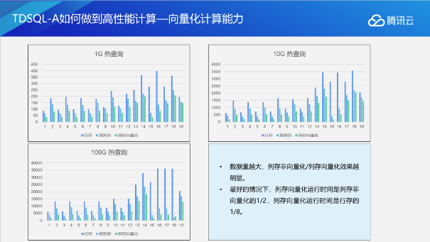 向量化计算能力在OLAP上也是一个必须探讨的课题。TDSQL-A也进行了一些新的尝试,并实现了向量化计算能力:数据量越大,列存非向量化和列存向量化效果越明显,在最好的情况下,列存向量化运行时间是列村非向量化的1/2,列存向量化运行时间是行村的1/8。列存储的向量化执行能够达到行存储执行1/8左右。向量化计算能力对整个OLAP性能的提升是非常明显的。