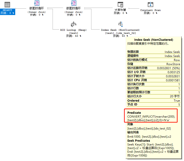这时就可以看出一些不同了,场景1中相同语句,因为隐式转换,导致用了Table Scan,而此处,虽然谓词提示CONVERT_IMPLICIT(c2),但未作为Warning,而且执行计划还是使用的Index Seek,路径上和场景1稍有不同,我猜这个是不是因为CONVERT_IMPLICIT的使用导致的?有知道的朋友,可以介绍下,