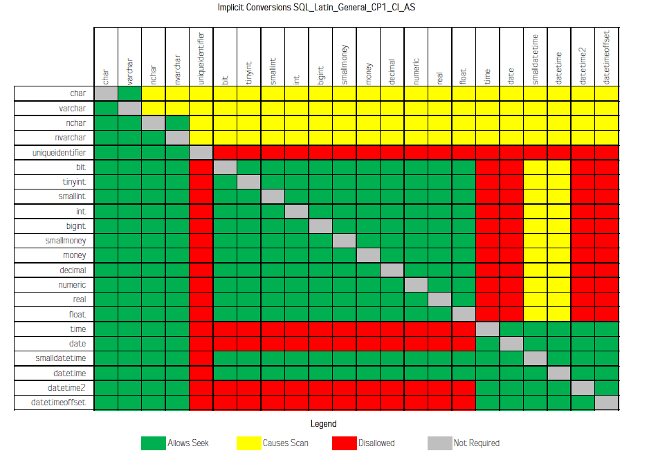 Jonathan Kehayias在这篇文章中,提到了SQL_Latin1_General_CP1_CI_AS和Latin1_General_CP1_CI_AS这两种排序规则不同数据类型的转换关系,如下所示,