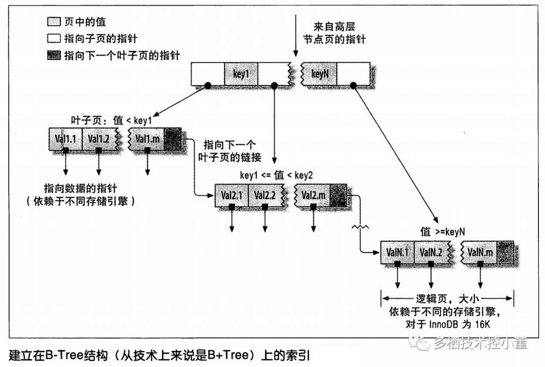 当人们谈论索引的时候,如果没有特别指明类型,那多半说的是BTree索引,它使用B-Tree数据结构来存储数据(实际上很多存储引擎使用的是B+Tree,即每一个叶子节点都包含指向下一个叶子节点的指针,从而方便叶子节点的范围遍历)。大多数MySQL引擎都支持这种索引。Archive引擎是一个例外:5.1之前Archive不支持任何索引,直到5.1才开始支持单个自增列(AUTO_INCREMENT)的索引。