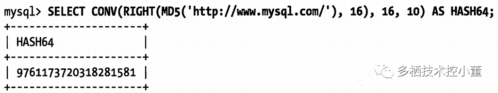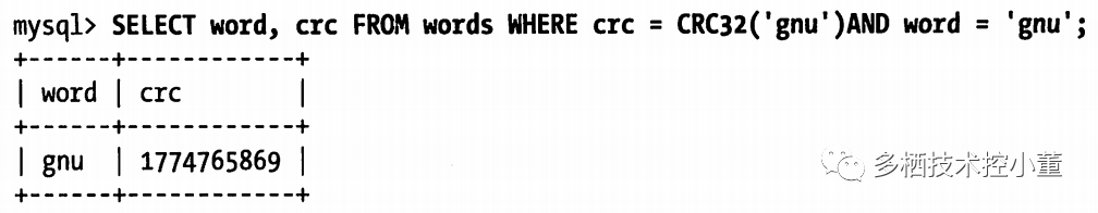 mysql> SELECT id FROM url WHERE url="http://www.mysql.com"-> AND url_crc=CRC32("http://www.mysql.com");