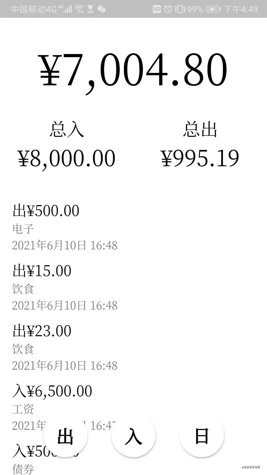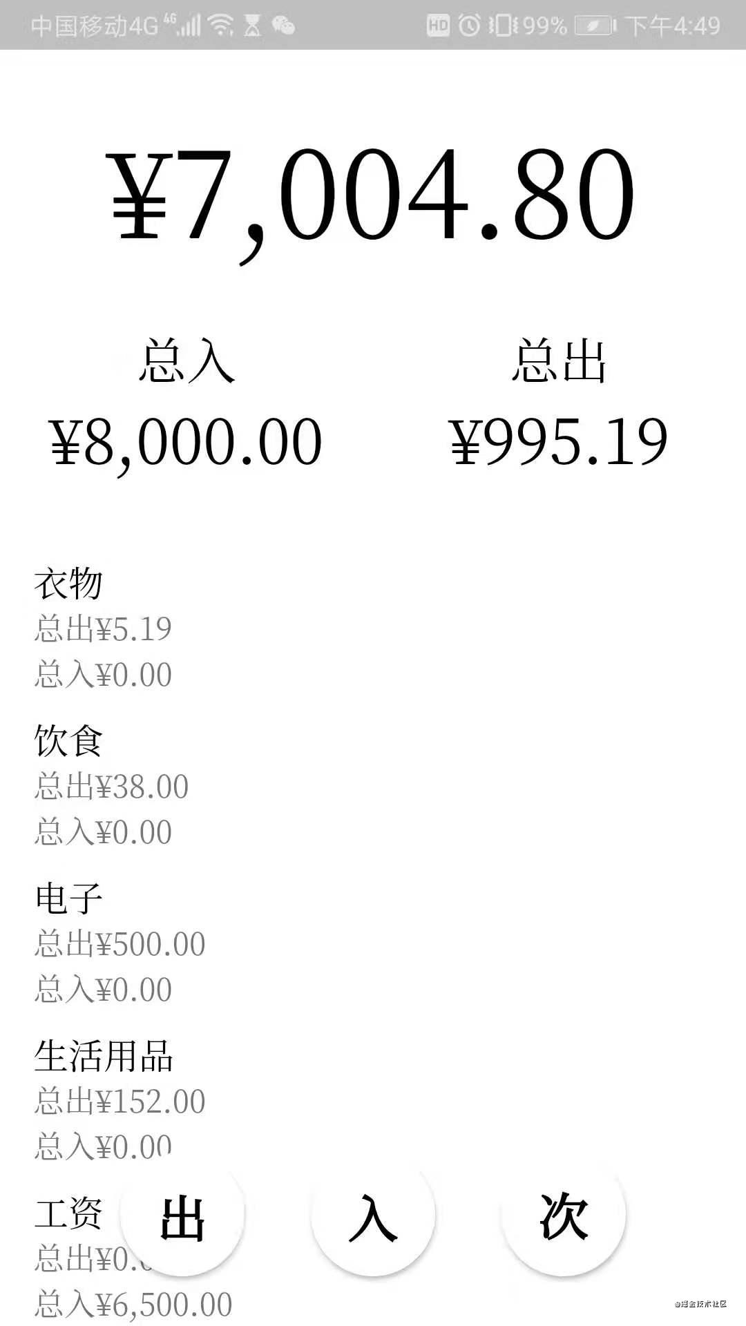 5、在出入APP页面,采用创建的云数据库账号密码来登录,进入出入记账APP首页;