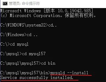 win + q:搜索cmd,右键以管理员身份运行 cd到mysql文件夹的bin目录下 执行语句:mysqld --install 出现successfully,表示安装成功