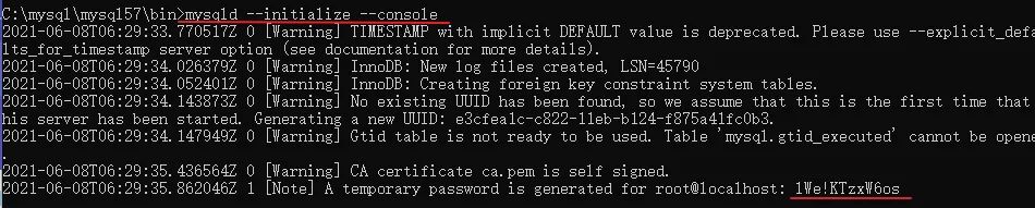 初始化:mysqld --initialize --console 生成随机密码:lWe!KTzxW6os lWe!KTzxW6os lWe!KTzxW6os